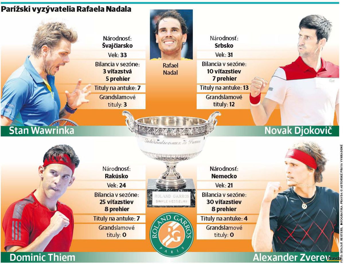 S kým ešte treba tento rok počítať? Novak Djokovič sa pod dozorom Slováka Mariána Vajdu opäť učí vyhrávať, lanský finalista Stan Wawrinka po dlhom výpadku zasa hľadá svoje tenisové ja. Marin Čilič, Grigor Dimitrov či Juan Martín del Potro môžu tiež pomýšľať aspoň na semifinále. Naopak, v Paríži budú chýbať stálice – Roger Federer, Andy Murray, Jo-Wilfried Tsonga a Milos Raonic.